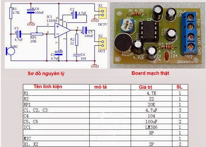 The sơ đồ nguyên lý tụ điện C6 là tụ lọc nguồn, Biến trở RP1 dùng để điều chỉnh âm lượng, IC1 là LM386 IC khuếch đại âm thanh, MIC dùng loại micro electret nó sẽ chuyển đổi âm thanh thành tín hiệu điện, R1 là điện trở cung cấp nguồn cho MIC, C1 và C5 là các tụ đầu vào và đầu ra, tải đầu ra là loa có tính cảm kết hợp với tụ C5 tạo thành bộ lọc LC, R2 và C4 đảm bảo độ ổn định cho mạch, C3 dùng để lọc bỏ thành phần AC.