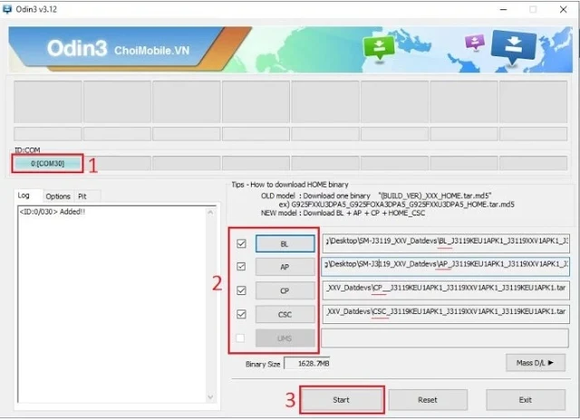 – Kết nối điện thoại vào máy tính bật phần mềm Odin trên máy tính, kiểm tra Odin đã nhận thiết bị hay chưa (1), giải nén file Rom, chọn các file BL, AP, CP, CSC (2) đúng vị trí tương ứng, rồi bấm Start (3) theo hướng dẫn như hình.