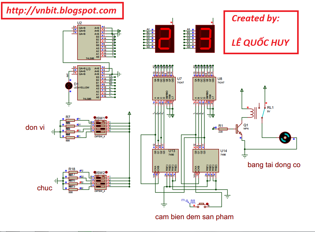 Mạch đếm sản phẩm dùng IC số, có cài đặt được số đếm được sử dụng bởi 3 khối IC (74LS85, 7447, 7490) . Gồm 2 khối cài đặt số đếm sử dụng theo mã nhị phân.