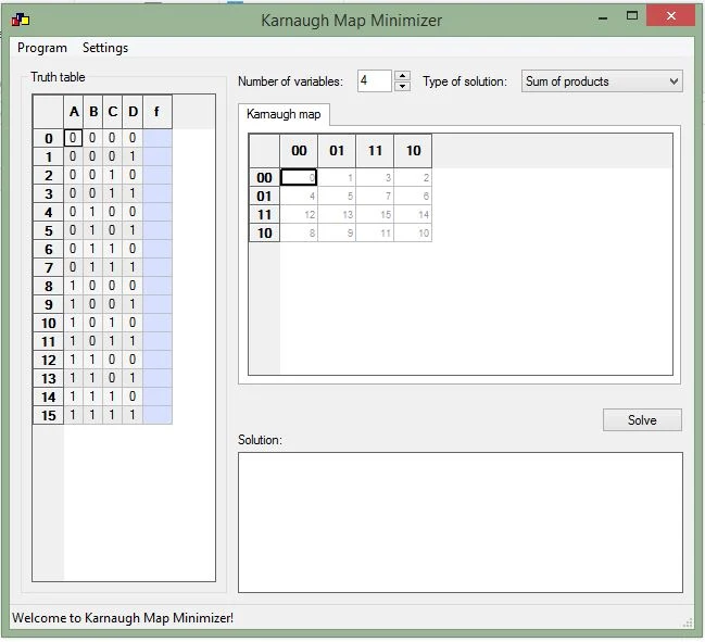 Karnaugh Map Minimizer là phần mềm nhằm giảm thiểu thời gian cho việc tối thiểu hóa bìa Karnaugh,nhằm hỗ trợ cho quá trình học tập một cách nhanh chóng, nhất là cho môn Kỹ thuật số.